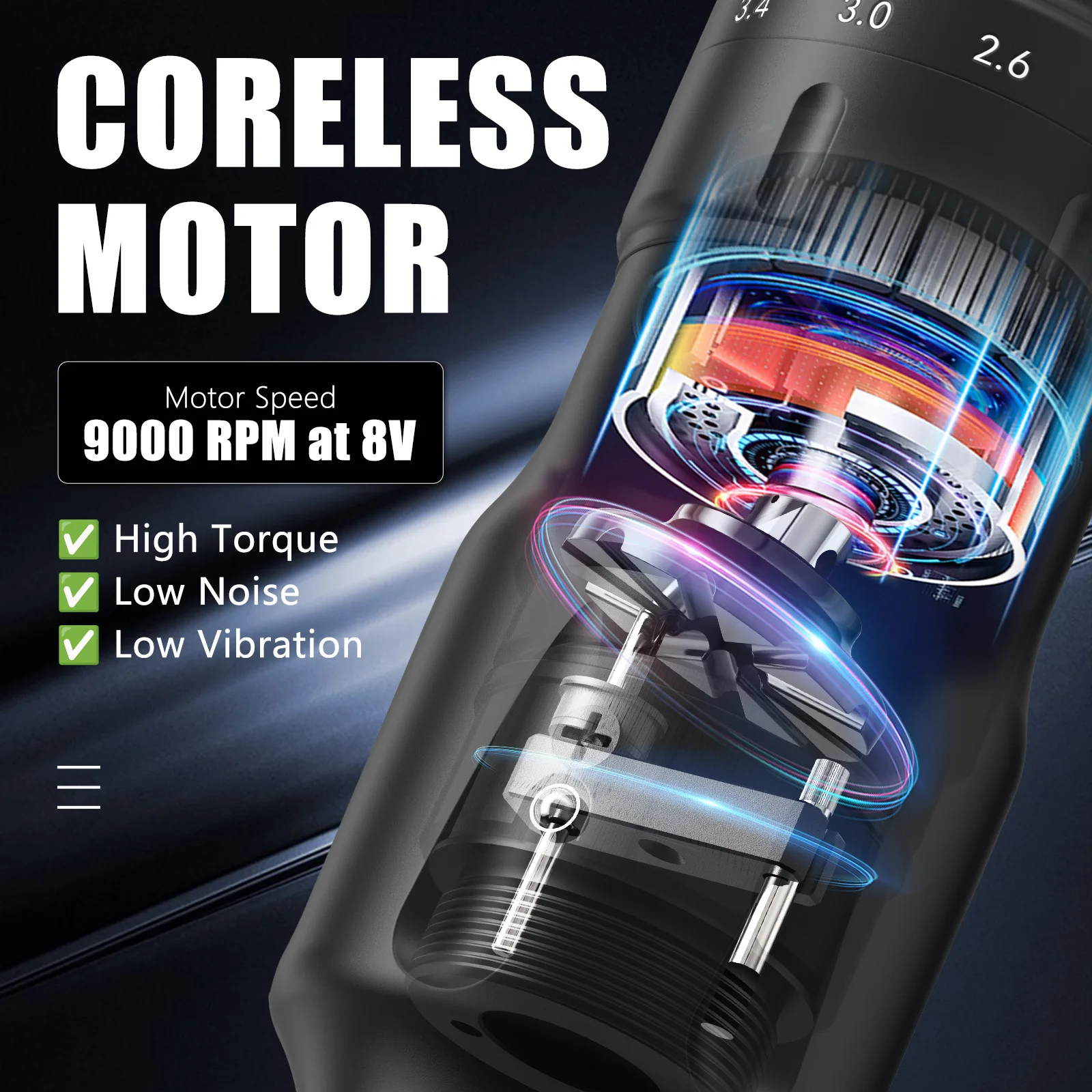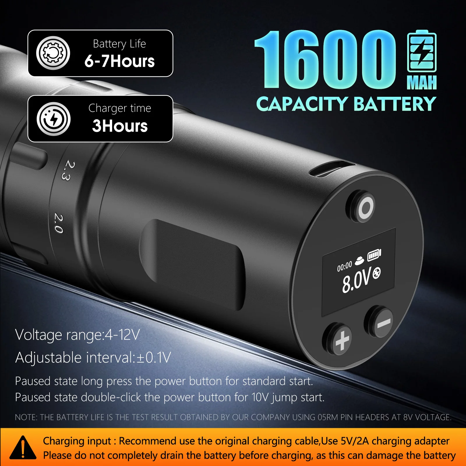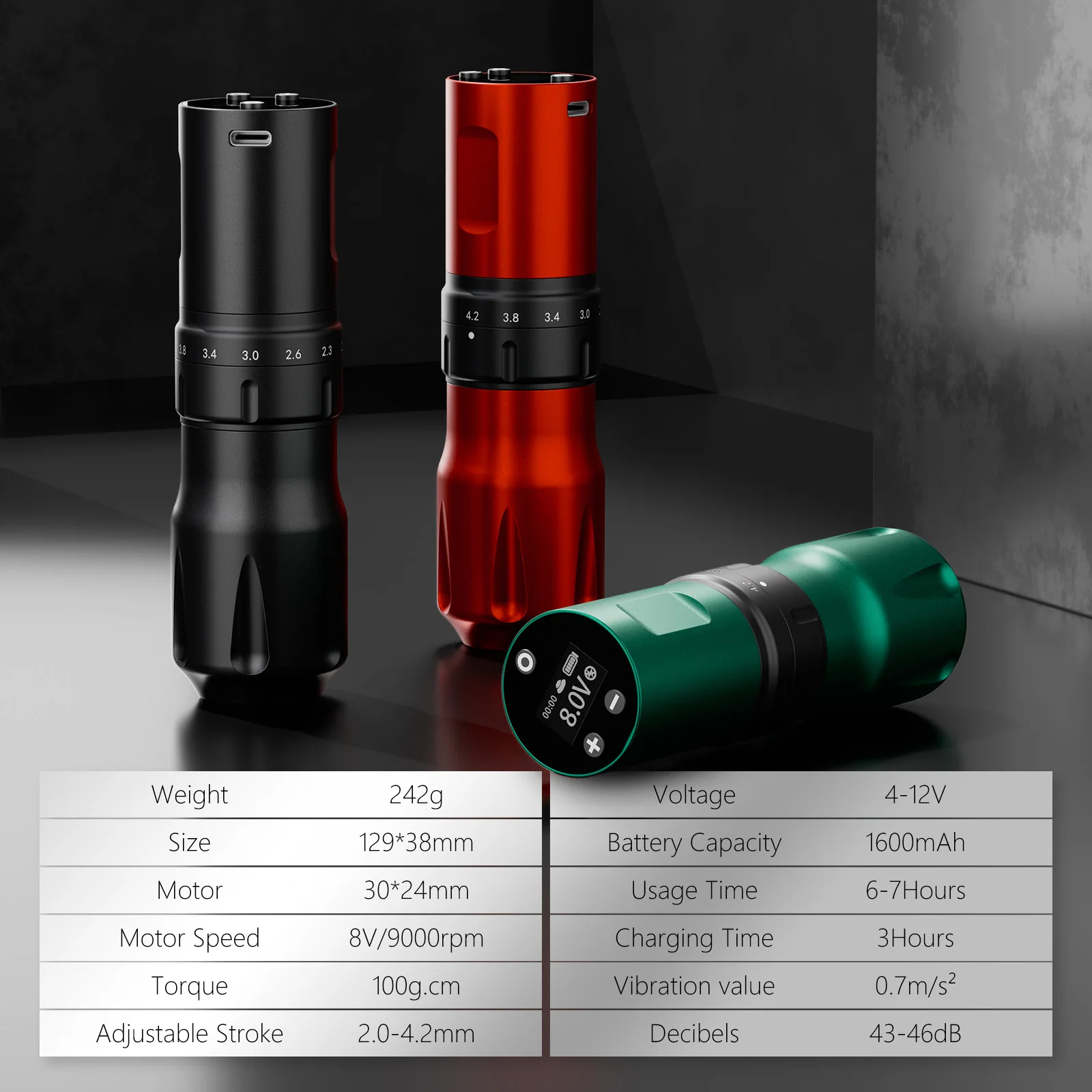 The tattoo pen has visible LDscreen shows operating voltage andremaining power,4V-12V adjustablevoltage, can support long-termtattoo work, output stable, batterycapacity is 1600mAh,designed fortattoo artrist or beginner.